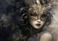 Maskerade - Intrigerend en sereen, dit portret fascineert met een vrouwelijk figuur gehuld in mysterie achter een versierd gouden masker. De styling is modern met een klassieke ondertoon, en het kleurenpalet is rijk aan donkere, zwoele tinten contrasterend met glinsterende gouden accenten die de geheimzinnigheid extra benadrukken. De blik van de vrouw, tegelijkertijd direct en ondoorgrondelijk, versterkt het thema van verborgen waarheden.