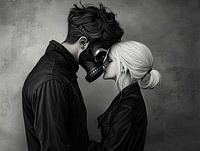 Dit kunstwerk vangt een intiem en intrigerend moment vol contrasten en emotionele lagen. We zien een jongeman met een gasmasker dat een gevoel van afstand creëert, terwijl hij teder een jong blond meisje kust.