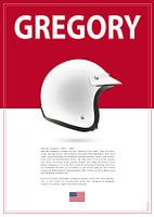Afdrukken met de persoonlijke valhelmen van beroemde coureurs uit de jaren 1950 en 1960.