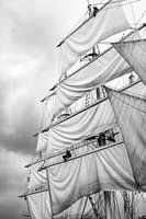 Klassieke zeilschipmasten met zeilen op de IJssel tijdens het Sail Kampen-evenement in 2018. Zwart wit foto met bewolking in de achtergrond.