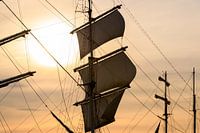 Oud zeilschip bij de rivier IJssel tijdens het 2018 Sail Kampen in de Hanzestad Kampen in Overijssel. Het schip neemt deel aan de vlootschouw tijdens zonsondergang aan het begin van het evenement.