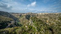 Opname van Matera vanuit de kant van het ravijn naast de stad.