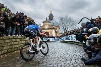 Mathieu van der Poel op de Muur van Geraardsbergen op weg naar de winst in de Omloop Het Nieuwsblad, De openingsklassieker van het Belgisch wielerseizoen.