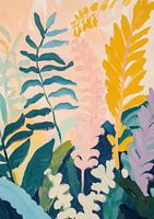 Een acrylschilderij in de stijl van Matisse met heldere pastelkleuren en krachtige penseelstreken; een abstracte achtergrond met planten en bloemen in lichtroze, geelgroen, blauwpaars en wit; de schoonheid van de natuur is gevangen door minimalisme en een helder kleurenpalet. De compositie bevat close-ups van varens en kleine bloemen.