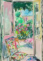 Matisse, een schets van een open raam met bloemen in de tuin buiten, pastelkleuren in roze en groen, een schets op papier met losse, gebarende streken en dunne lijnen, een kleurrijke potloodtekening, grote ramen, een open deur, stoelen en een kleurrijk tapijt op de vloer, op een zonnige dag.