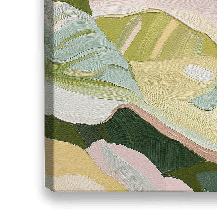 Abstract schilderij met grote bananenbladeren, lichtroze achtergrond, delicate groene en lichtgele tinten, witte penseelstreken, olieverf op doek, minimalistische stijl, hoge mate van detail, close-up, zichtbare textuur, vintage sfeer, in de stijl van Henri Matisse.