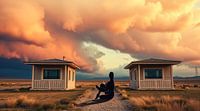 In dit werk worden de grenzen tussen realiteit en verbeelding op fascinerende wijze vervaagd. Twee huizen staan tegenover elkaar in een uitgestrekte, lege vlakte, gescheiden door een schaduwachtige, silhouetvormige figuur die doet denken aan de uitgesneden vormen van Henri Matisse. De lucht, met dramatische tinten van oranje en roze,…