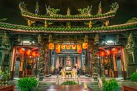 Deze prachtige tempel in Lukang, Taiwan was rustig in de avond. Tijdens de dag was het erg toeristisch. Ik genoot van de rode lantaarns die hun kleuren over de tempel lieten schijnen en de mensen die rustig aan het bidden waren.