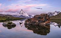 De Matterhorn wordt gereflecteerd in een bergmeer bij zonsopgang