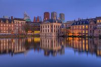 Mauritshuis Museum, Binnenhof en Het Torentje weerspiegeld in de Hofvijver nar zonsondergang