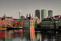Deze romantische weergave van het Mauritshuis aan de Hofvijver in Den Haag geeft uw interieur een klassieke uitstraling. De illustratie is geïnspireerd op de bekende stijl van bloemschilderingen tegen een zwarte achtergrond.