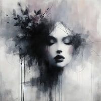 Dit intrigerende zwart-witte abstracte werk vangt de elegantie van een vrouw met bloemen/planten in haar haar in de kleur Mauve. De krachtige contrasten creëren een tijdloze esthetiek, waarbij de bloemen symbool staan voor groei en vernieuwing. De organische verstrengeling symboliseert de harmonie tussen mens en natuur, terwijl de…
