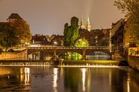 Maxbrücke en St. Lorenz in de oude stad van Neurenberg bij nacht.