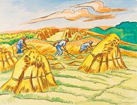 Drie figuren in blauwe kleding zijn actief bezig met het maaien en verzamelen van graan, omringd door bundels in kegelvormige stapels.