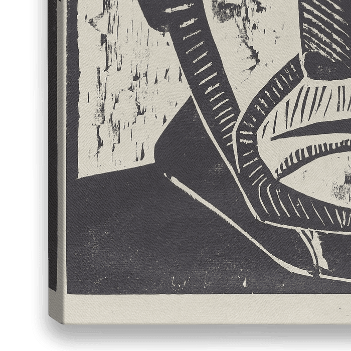 Een krachtig, frontaal close-up portret van een visser in houtsnede-stijl: een oudere man met een brede pet (of schippersmuts) met strepen, een lange, volle baard en snor, grote starende ogen, prominente neus en een strakke mond. Het gezicht is sterk gestileerd en maskerachtig, met dikke, hoekige contouren en zware zwarte vlakken die de…