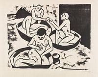 Een monumentale houtsnede waarin Pechstein drie naakte figuren afbeeldt in bootvormige structuren — een beeld van lichamelijke rust, ritmische compositie en grafische intensiteit.