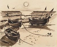 Het schilderij toont een kustlandschap bij zonsopgang, waarin meerdere boten op het strand liggen. De boten zijn ruw en hoekig weergegeven, met sterke, donkere contourlijnen die duidelijk afsteken tegen de lichte achtergrond. Ze liggen schuin in het beeldvlak, deels met touwen aan elkaar verbonden, wat een gevoel van stilstand maar ook…