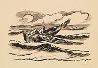 Een dynamische, expressieve inkttekening (of pen/brush op papier): twee vissers in een kleine open boot worstelen met het binnenhalen van een groot net op woelige zee. De boot helt sterk naar één kant door de golven, de mannen zijn gebogen over de rand, armen gestrekt, lichamen gespannen in arbeid. De zee is weergegeven met wilde,…