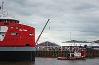 Easymax schip Maxima van Wagenborg wordt door sleepboot Waterstad in positie gebracht voor de doopceremonie door koningin Maxima. Tijdens DelfSail 2024 in Delfzijl.
