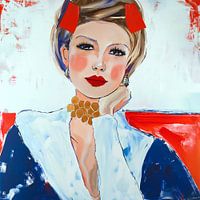 Kleurrijk impressionistisch portret van Máxima met grove penseelstreken op canvas in rood,wit en blauw tinten.