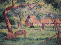 Bij de boerderij staan varkens onder een boom te eten en een vrouw, de boerin, voedert kippen op dit agrarische beeld.
