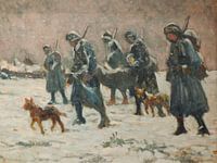 Tijdens een slag op het slagveld bij een oorlog brengen soldaten een soldaat weg die gewond is gekomen uit de strijd. Bij hen lopen honden mee door het slechte weer in de sneeuw.