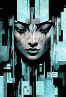 Mixed media in kubistische collage stijl met grunge textuur in voornamelijk zwart, lichtblauw en turquoise tinten.