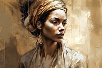 Abstract impressionistisch portret van een mooi meisje in mixed media stijl met grove penseelstreken op grof canvas in warme wit,beige en goud tinten.