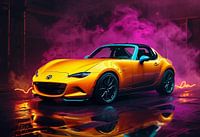 Tegen een achtergrond van damp en neon verschijnt de Mazda MX-5 Miata als een tijdloos icoon van balans en opwinding. Het digitale kunstwerk hult de auto in stralende reflecties, waardoor elke contour een streep licht en beweging wordt. De rokerige stadsnacht voelt ritmisch aan - oplichtende borden, nat wegdek en beweging in de verte versmelten tot een symfonie van kleur. De Miata staat in het middelpunt, elegant maar ongetemd, een herinnering dat kracht niet altijd draait om grootte maar om verbinding - tussen snelheid, stijl en emotie.