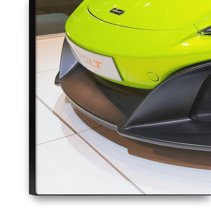 Felgroene McLaren 675LT sportwagen vooraanzicht. De 675LT is opgebouwd uit een met koolstofvezel versterkt polymeer chassis, en wordt aangedreven door een M838T 3,8-liter V8 twin-turbo motor, die 641 pk ontwikkelt.