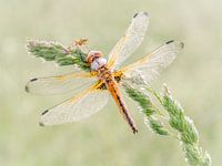 Een bruine korenbout met een strontvlieg in de vroege ochtend. Beide zitten nog onder de dauw.