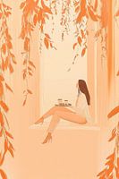 Een illustratief portret van een vrouw die in het raamkozijn zit met koffie en een taartke. Genietend naar buiten te kijken. In zachte kleuren van roze, oranje en creme om het ochtendlicht te illustreren.