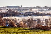 Heldere zonsopkomst op een zonnige winterdag met een vleugje sneeuw. Op de voorgrond Mechelen, op de achtergrond de kerk van Vijlen.