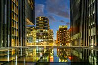 Moderne hoogbouw architectuur van de Media Harbour wijk in Düsseldorf bij schemering, Noordrijn-Westfalen, Duitsland, Europa | Moderne architectuur van de Media Harbour wijk in Düsseldorf bij schemering, Duitsland, Europa