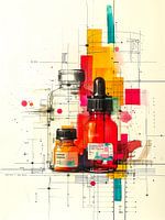 Aquarelverfschilderij met medicijnflesjes met etiketten erop, gevuld met kleurrijke vloeistof, en verschillende lijnen die de structuur van deze flesjes voorstellen, allemaal tegen een witte achtergrond. Het ontwerp bevat heldere oranje, roze, groenblauwe, geelgroene en paarse tinten, waardoor een levendig contrast ontstaat tussen de…
