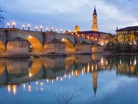 Medieval bridge and El Salvador cathedral (La Seo) reflecting on the Ebro river.
