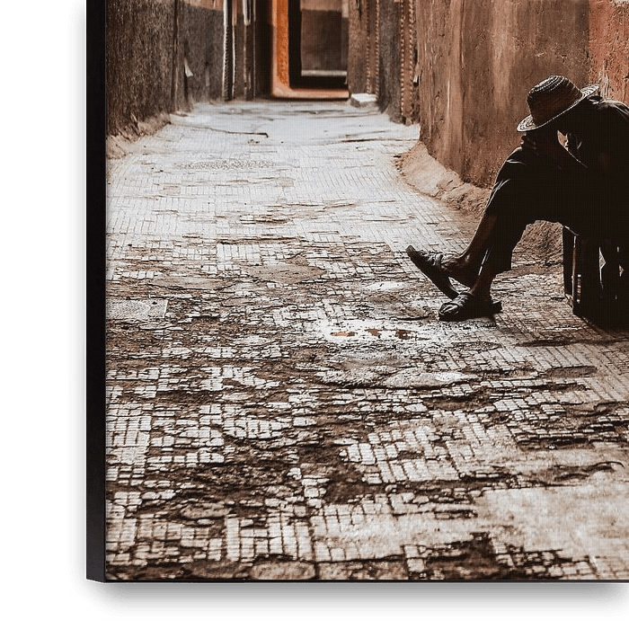 In de smalle steegjes van Marrakech, waar warme aardetinten de muren kleuren en het zonlicht zacht naar binnen valt, lijkt de tijd even stil te staan. De verweerde structuren en het subtiele spel van licht en schaduw geven het beeld een bijna schilderachtige uitstraling. Je blik wordt vanzelf de diepte in getrokken, richting het lichte…