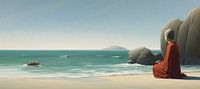 Meditatie Kunstwerk - Dit schilderij toont een serene scène van een figuur in een robijnrood gewaad, zittend op een zandstrand, starend naar een kalme zee met zachte golven en een eiland in de verte. De stijl is realistisch met een zekere mate van minimalisme, en de kleuren zijn voornamelijk zachte blauw- en zandtinten, die een gevoel…