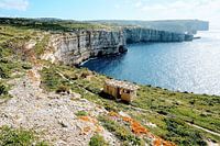 Een ontspannende opname van de zee met kliffen en planten. De Middellandse Zee als een meditatief ontspannend beeld.