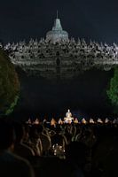 Elk jaar wordt Waisak gevierd bij de Borobudur met meditatie en gebed en het oplaten van lampionnen na zonsondergang. Mensen zitten op de grond voor de meditatie en het gebed, welke geleid wordt door de boeddistische monniken in hun oranje kleding op het podium aan de voorkant.