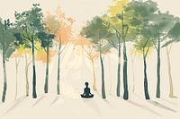 Dit serene kunstwerk vangt de essentie van rust en contemplatie in een minimalistische stijl. Een silhouet van een persoon in meditatiehouding bevindt zich te midden van hoge, slanke bomen, die zachtjes worden verlicht door het gefilterde zonlicht. De eenvoud van het ontwerp, met subtiele kleuren en zachte lijnen, roept een gevoel van kalmte en introspectie op. Perfect voor ruimtes waar rust en concentratie centraal staan, zoals slaapkamers of kantoren. Dit kunstwerk nodigt uit tot een moment van reflectie en innerlijke stilte, en brengt een vleugje natuur en sereniteit in elk interieur.