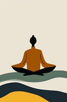 In een harmonieuze samenvloeiing van zachte kleuren straalt een meditatieve figuur sereniteit uit. De rechte houding en uitgestrekte handen nodigen uit tot kalmte en reflectie, terwijl gebogen golven in rustgevende aardetinten de innerlijke reis symboliseren. Deze compositie roept het streven naar innerlijke rust en mindfulness op.