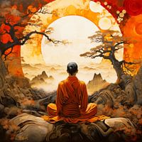 Meditatie moment in zen landschap, kunst print in warme oranje rode tinten.