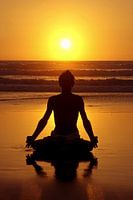 Meditatie op het strand bij zonsondergang aan zee