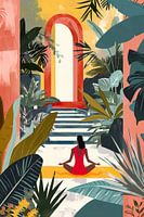 "Meditatief Portaal" biedt een blik op een vredige meditatiesessie in een tropische tuin, met een openstaande deur die uitnodigt tot nieuwe mogelijkheden. De vrouw, centraal in deze oase van rust, belichaamt innerlijke vrede en het potentieel dat meditatie biedt voor zelfontdekking en vernieuwing. De levendige vegetatie en de stralen van de opkomende of ondergaande zon creëren een sfeer van hoop en inspiratie.