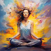 Dit canvas kunstwerk viert de diepe rust en harmonie van gedachtenloze meditatie. De kleurrijke en golvende bewegingen vangen de innerlijke vrede van een mediterende vrouw. De dikke verf in impasto stijl voegt diepte en textuur toe, ideaal voor een Art Frame of Canvas met baklijst.