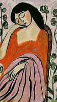 De vrouw heeft een ontspannen, bijna dromerige houding, met haar hoofd zachtjes rustend op haar hand. Haar ogen zijn gesloten, wat een gevoel van rust en introspectie geeft. De achtergrond en de kleding van de vrouw zijn uitgevoerd in warme tinten rood en oranje, aangevuld met zachte roze en beige tinten. Interessant zijn de gestileerde groene planten in de achtergrond die een natuurlijke, rustige sfeer toevoegen aan het tafereel.