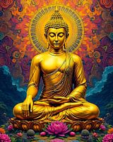 De subtiele verlichting benadrukt de contouren van het beeld en laat het bijna zweven in de lucht, alsof het omgeven is door spirituele energie. Deze minimalistische compositie nodigt de kijker uit om even stil te staan en bij zichzelf naar binnen te kijken. Het creëert een sfeer van contemplatie die aanzet tot reflectie en innerlijke rust. Dit beeld legt niet alleen de fysieke aanwezigheid van de Boeddha vast, maar ook de essentie van vrede en verlichting die hij belichaamt - een uitnodiging om na te denken en op zoek te gaan naar innerlijke balans.