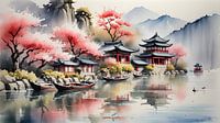 Dit kunstwerk vangt de serene schoonheid van een traditioneel Aziatisch dorp aan het water, gehuld in de bloesems van kersenbloemen. De pagodes met hun karakteristieke daklijnen en rode accenten staan statig langs de waterkant, terwijl de reflecties in het rustige water een gevoel van diepte en harmonie toevoegen. De delicate…