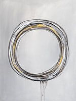 Dit beeld is als intuïtief schilderij ontstaan. Het contrast tussen zwart en wit met een gouden accent geeft balans. De druppels doorbreken de cirkelvorm en geven spanning. De kalmte van de zwevende ronde…